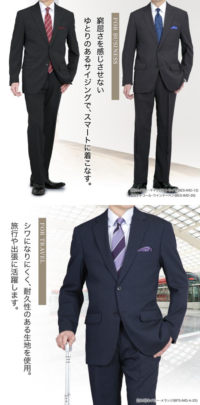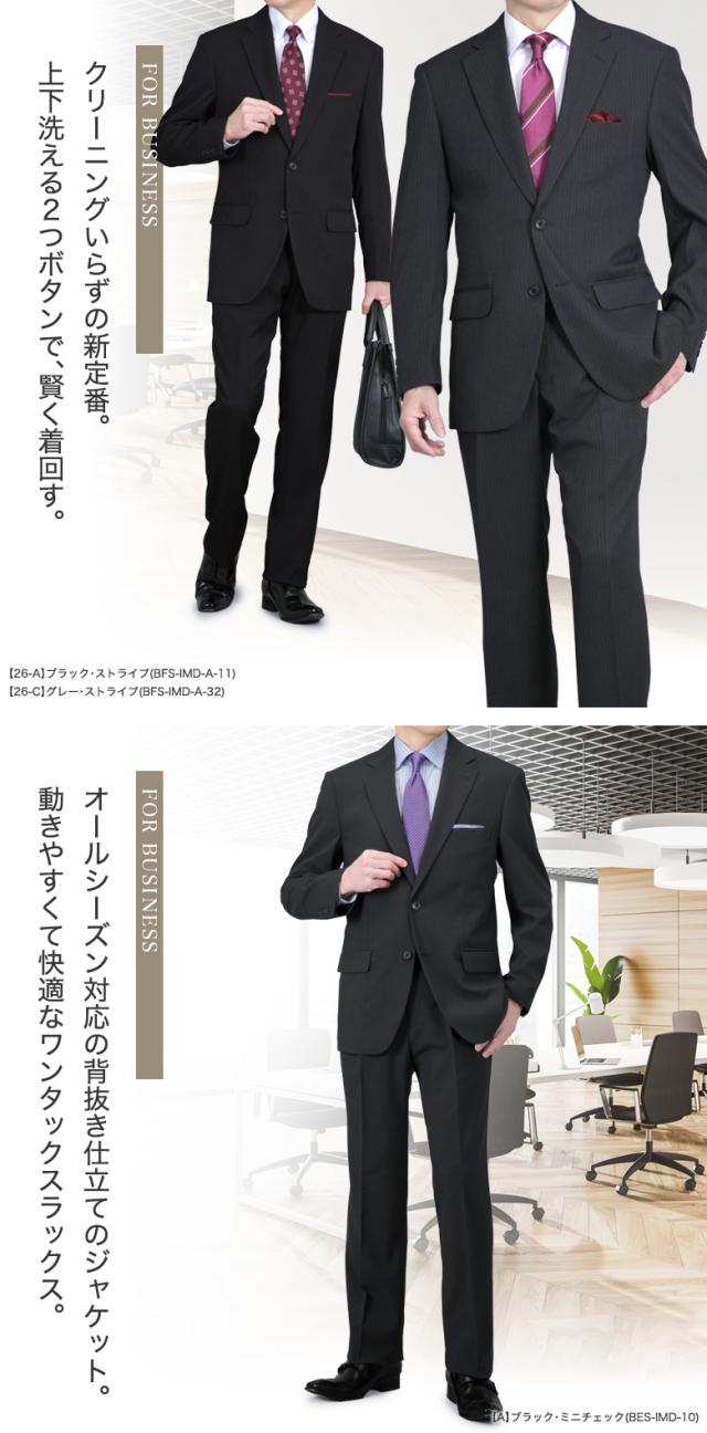 | ▼ジャケット ・2ツボタン ・背抜き仕立て ・袖3ツボタン ・センターベント ・フラップポケット ▼スラックス ・ワンタック ・膝裏付 ・リンクルフリー(防シワ) ・ストレッチ素材 ・プリーツ加工 ・ウォッシャブル (洗濯機で洗える上下ウォッシャブルタイプ) |