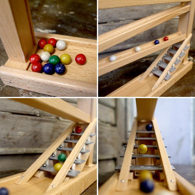 人気の秘密は何といっても、落ちていく玉が鉄琴の階段を通るときに奏でる美しい音、そしてゆるやかにスロープを左右に降りていく玉の動きです。