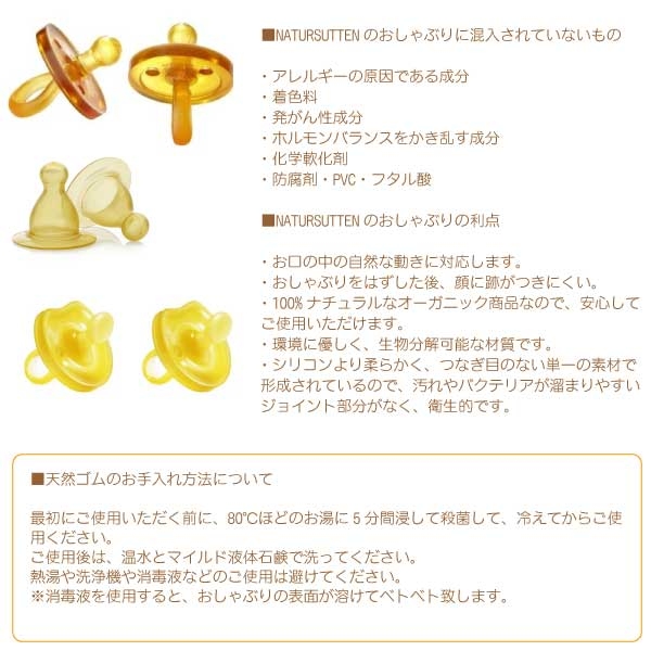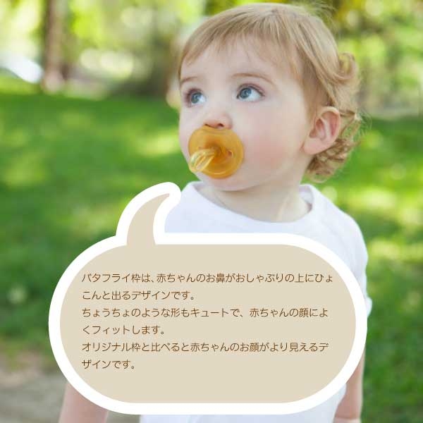 デンマークのEco Baby社の天然ゴム100%のおしゃぶり。ベビーにも地球にもやさしいおしゃぶりNATURSUTTEN(ナチュアスッテン)です。デンマークのEco Baby社の天然ゴム100%のおしゃぶり。ベビーにも地球にもやさしいおしゃぶりNATURSUTTEN(ナチュアスッテン)です。バタフライ枠は、赤ちゃんのお鼻がおしゃぶりの上にひょこんと出るデザインです。ちょうちょのような形もキュートで、赤ちゃんの顔によくフィットします。オリジナル枠(ラウンド枠)と比べると赤ちゃんのお顔がより見えるデザインです。ただ、お鼻と口の間が短い又は月齢が小さいお子さんには、お鼻が隠れてしまうこともあります。歯科矯正型とは、歯並びに良くなるわけではありません。赤ちゃんがお母さんの乳首を吸った時の形に似せている為、よりフィット感があり、歯並びに影響を与えにくい形と言われています。日本で多く使用されているおしゃぶりは歯科矯正型のタイプです。NATURSUTTENのおしゃぶりは、パラの木(Hevea brasiliensis)から取れる100%天然ゴムにて作られています。ラテックスアレルギーの原因となるタンパク質は、生産の間に排除されていますので、アレルギーの心配はありません。 ヨーロッパの安全基準であるCEを取得