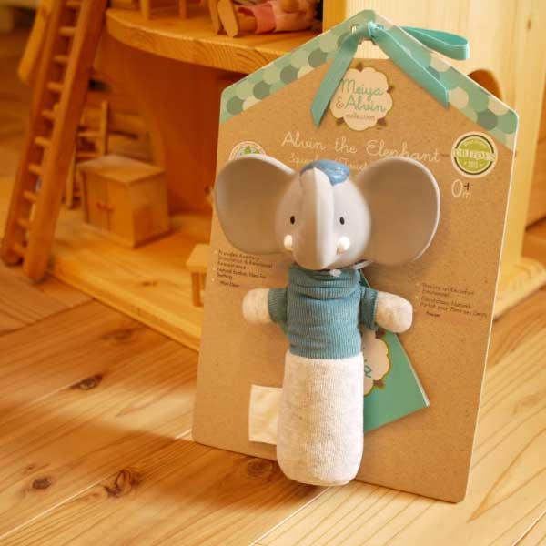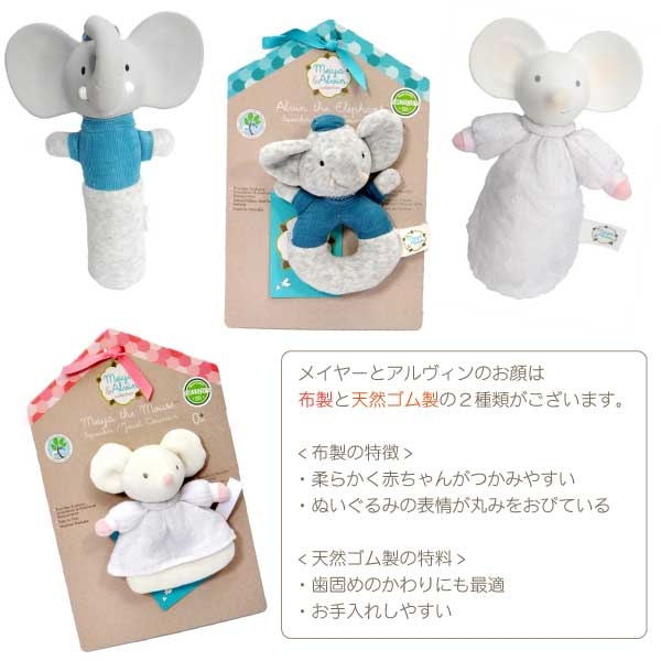 かわいいゾウのアルヴィンが笛(スクイーク)タイプのにぎにぎおもちゃに。お腹を押すと、キュキュっと可愛い音がします。メイヤー&アルヴィンとは...Meiya & Alvinとは、スリランカ発のプレミアムなベビートイです。絵本の世界から飛び出したキャラクター、ネズミのMeiyaとゾウのAlvinが大切なベビーにやさしく寄り添います。かけがえのない自然と子どもの成長を守ることをコンセプトにつくられた製品は、素材や塗料への配慮から欧米を中心に高く評価されています。メイヤー&アルヴィンのこだわりパラゴムノキから環境を維持させながら集められた天然ゴムは、無香料なので子どもを安心させる効果があります。また、ナチュラルコットンと植物由来成分の塗料を採用し、自然と子どもたちへの配慮はもとより、やさしさが伝わるデザインは世界各国から支持を集めております。メイヤー&アルヴィンの楽しみ方大きさもちょうどお子さまが手に取れるサイズに設計されており、持ったり、にぎったり、振ったりすると音がなり、おもちゃに新たな発見が生まれます。好奇心が、自ら動かす意志を芽生えさせ、探究心が育ちます。メイヤーとアルヴィンのお顔は布製と天然ゴム製の2種類がございます。