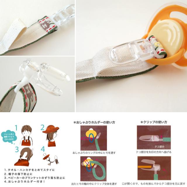 タオルやハンカチを留めてスタイに、帽子などの落下防止に、ベビーカーのブランケットのずり落ち防止に、おしゃぶりホルダーとしてなど、2本セットでいろいろ使えます。