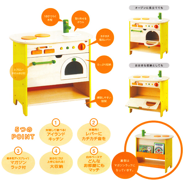 | Ed.inter(エドインター)のコミュニケーションツールとして遊べるアイランド型(対面型)の木製おままごとキッチンです。 キッチンを挟んで、対面でお話しながら楽しくおままごと!インテリアを邪魔せずリビングに合う木製のスタイリッシュなおままごとキッチン♪本体後ろには本などを収納できるスペースもあって収納棚としても使用できます。 天板の上に壁がないため、キッチンを挟んで向かい合って遊べます。 エドインターの『木のままごとあそび』シリーズや、その他のおままごとセットを組み合わせて遊ぶこともできます♪ ※組み立て式となります。 ※写真のキッチン以外の玩具は別売りになります。 |