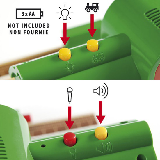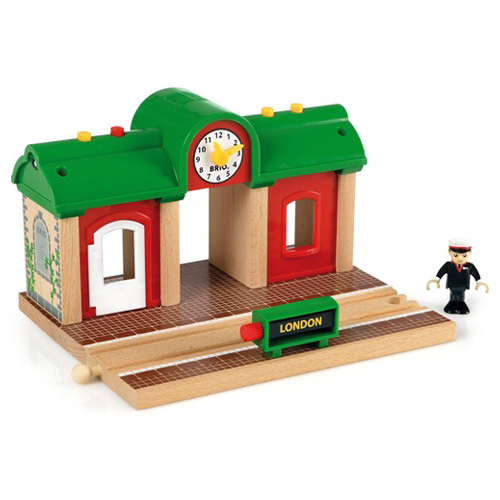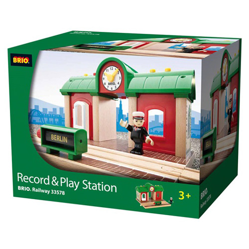 組み立てたレールの周りをいろどる追加アクセサリーです。 BRIOのレールウェイシリーズは、追加アクセサリーも豊富で、子どもたちの遊びの世界を広げてくれます♪ アナウンスが流れる駅のプラットホームと駅員さんのセットです。 自分の声を録音してアナウンスしてください。 ライトを付けたり、汽車の音を出すこともできます。 行き先表示はツマミをますと変わります。 ※単3電池×3使用。電池は付属しません。 |