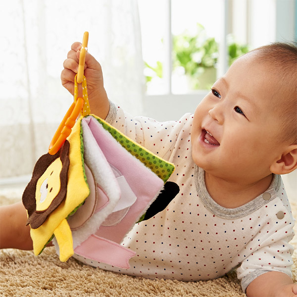 ベビーカーに付けられるので、外出時にも遊べます。布絵本は手洗いできますので、清潔に遊ぶことができます。