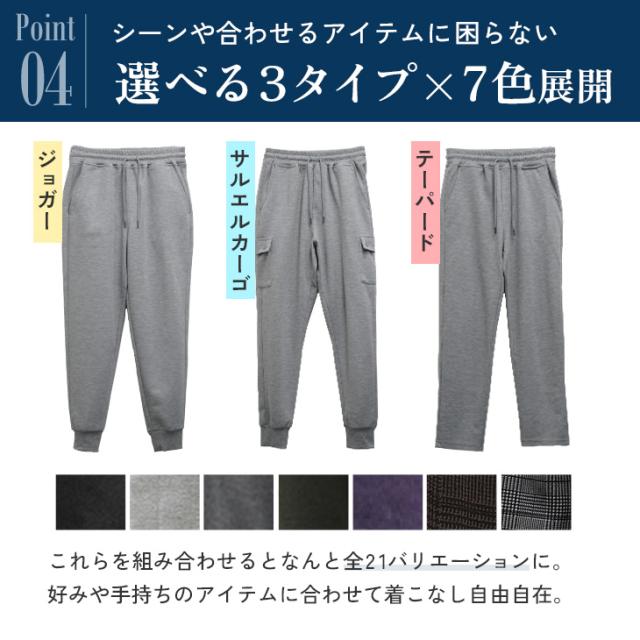 ●『新型』ジョガータイプが加わった、選べる3タイプ従来の、カジュアルな雰囲気を演出する「カーゴパンツタイプ」と、コーデが綺麗にまとまる「テーパードパンツタイプ」の2タイプに加えて、スッキリした美しいシルエットでカジュアル穿きできる「ジョガーパンツタイプ」が新登場。