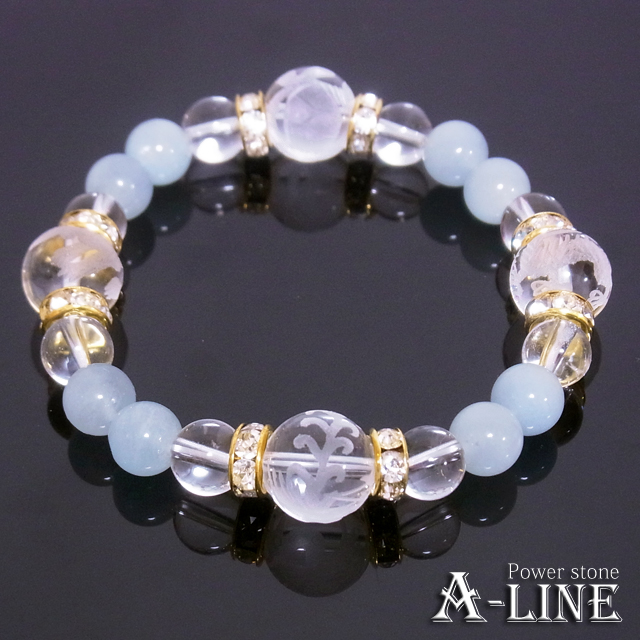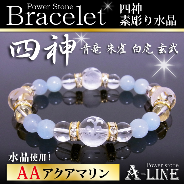 パワーストーン ブレスレット 金運UPに 四神素彫り水晶12mm&AAアクアマリン&水晶8mm PW-3275