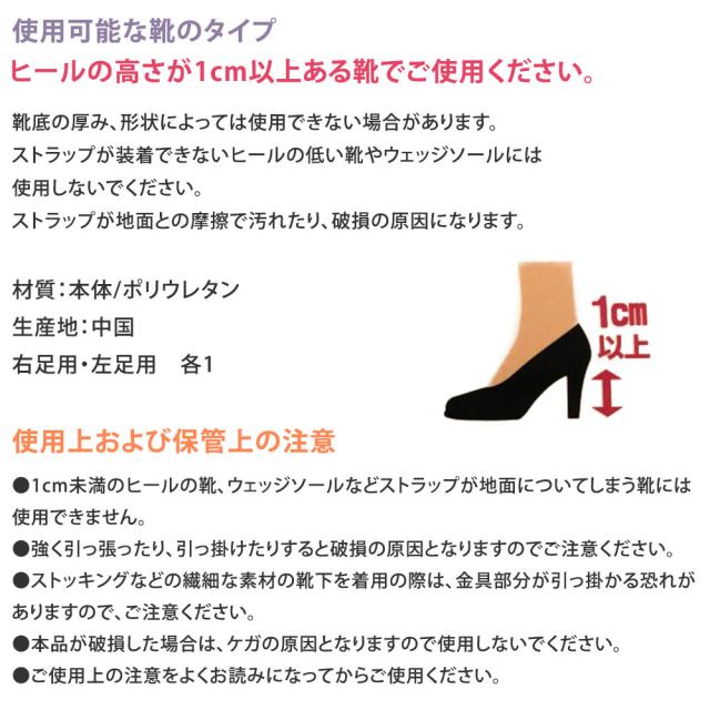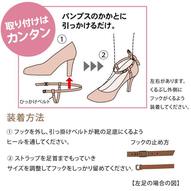歩いていると、パンプスが脱げて困る足に合わずに歩きにくい!そんな悩みを解消してくれるパンプスストラップ。パンプスのヒールにサッと引っかけるだけでストラップ付きのヒールの完成。歩行時にパンプスが脱げるのを防止してくれます。後ろリボンは取り外し可能でパンプスやファッションに合わせてオシャレを楽しめます。