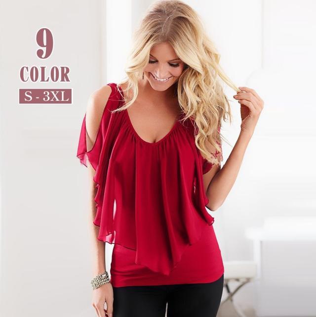 ノースリーブ カットソー レディース トップス シフォン フリル タンクトップ オープンショルダー Vネック 大きいサイズ 無地