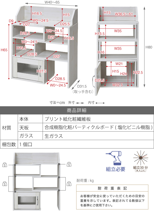 Lycka land カウンター下収納 スライドラック カントリー風 モデム ルーター収納 伸縮タイプ 幅40 から 幅65 調整可能 高さ80 スリムラ・ 母の日