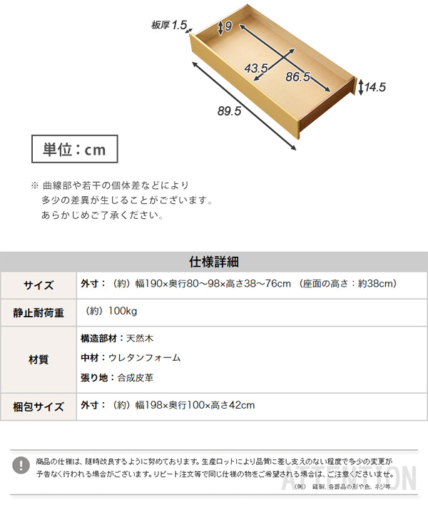 外寸:(約)幅190x奥行80〜98x高さ38〜76cm