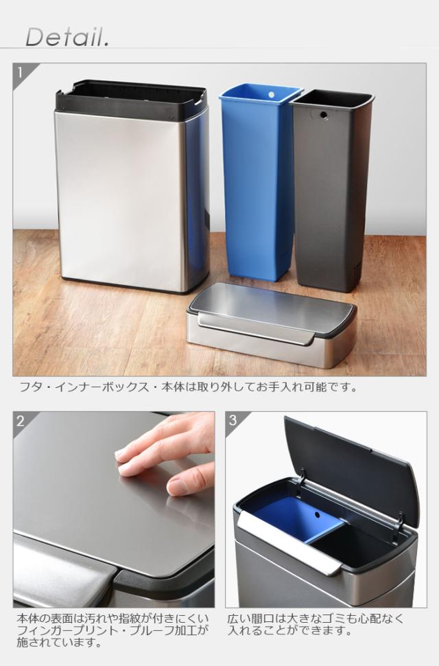 インナーボックスが2つ付いているので、燃えるゴミと燃えないゴミ、ビンや缶などのリサイクルなど…1つのゴミ箱の中で分別して収納することができます。ゴミ箱の幅はわずか50cm。ゴミ箱を2つ用意して並べるよりも、見た目もスマートで省スペースです。インナーボックスは1つ24Lサイズ。左右で色が違うのでゴミを捨てる際もぱっと一目で分かりやすいのもポイント!