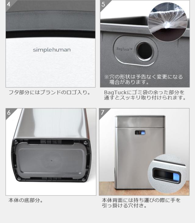 機能性とデザイン性に優れたアメリカのブランド「simplehuman」からダストボックスの登場です。実用性と耐久性の追求から生まれた抜群の機能により、長くご愛用いただけるアイテムに仕上がっています。一番の特徴はフタを開閉するタッチバーが本体の上部に付いていること。ゴミ捨てのスムーズさを考慮して設計されたタッチバーは、両手が塞がっている時も腰や肘で軽くプッシュするだけで簡単にフタを開けることができます。フタを閉めるのは手動ですが、スムーズかつ静かに閉まるのでお子さまのいるご家庭でも安心してご使用いただけます。上質なステンレス製のボディには指紋や汚れが付きにくい、フィンガープリント・プルーフ加工が施されていてお手入れも簡単。本体から取り外し可能なインナーボックス2個付きで、ゴミ箱の中で分別することができます。内側のゴミ袋が見えない様にデザインされているので見た目もスマートです。
