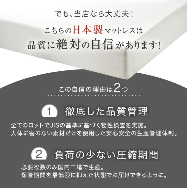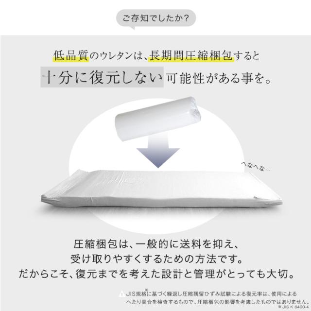 ※圧縮梱包のマットレスについて、ウレタンフォームの感温性(反発弾性フォームは温度が高くなると柔らかくなり、低くなると硬さが高くなる性質)により冬場、寒いところで復元させると、復元に時間がかかります。又、部分的に復元するタイミングが異なる場合がございます。室温が18度以上の部屋に半日くらいおくと、回復がしやすくなります。