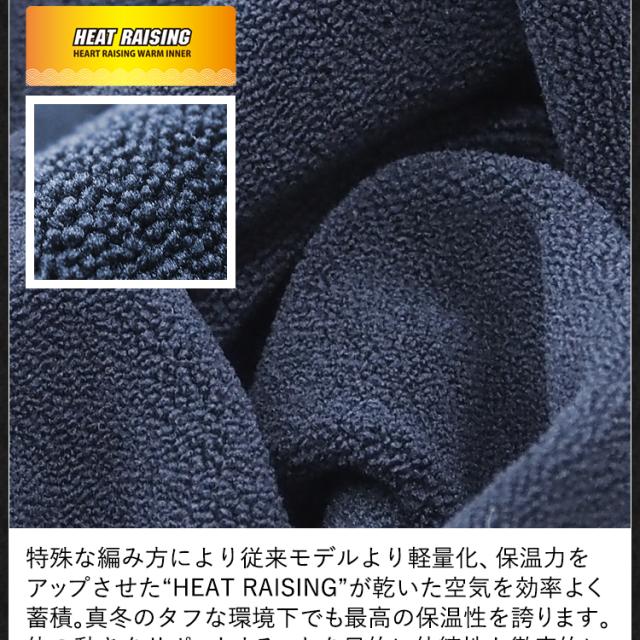 特殊な編み方により従来モデルより軽量化、保温力をアップさせたHEAT RAISINGが乾いた空気を効率よく蓄積。