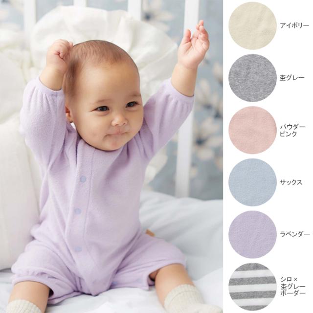 ふんわりとしたきめ細やかな肌触りと、吸水性に優れているので、汗っかきなベビーも快適。フロントが全開になるので、着替えやおむつ替えも簡単にできます。