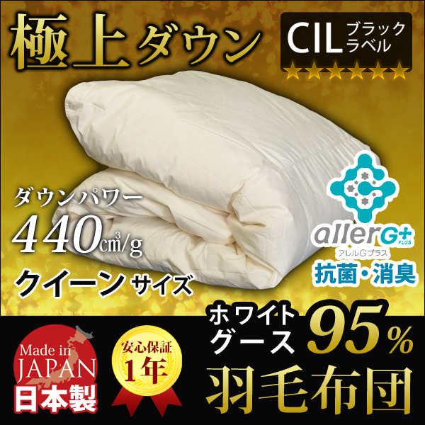【安心の日本製羽毛布団】 お手軽 羽毛掛ふとん ホワイトグースダウンがたっぷり入った羽毛布団です。 国内工場で羽毛の充填、縫製を行っているので、品質が高く、安心してお使いいただけます。 CILブラックラベル アレルG加工 アレル物質低減とデオドラント効果、抗菌・消臭加工された羽毛を使用。 ダックより保温性が高いホワイトグース 「グース」は、日本語でガチョウのことです。 「ダック(アヒル)」に比べ、体が大きいため、羽も大きくダウンボール (胸のあたりにあるタンポポのような白い綿毛)に、より多くの空気を含み ますので、保温性が高いです。 また、羽枝が細くてやわらかくコシがあるため、丈夫な上に、布団に使用 したときに肌触りが良くて体にフィットします。 クリーンオゾン加工 この羽毛ふとんに使用されている羽毛にはオゾン(O3)加工を施しています。 薬品を一切使用しない人や環境にも優しい最新の加工です。 ファインアップ加工 羽毛に活力を与えるとともに不純物を取り除く、ファインアップ加工を施しています。 本来の性能を最大に発揮できるように充分にリフレッシュした羽毛を使用しています。 日本製 国内工場で生産を行っております CILギャランティーラベル ブラックラベル 厳格で適正な全ロットの事前検査を通し、CILが定めた品質・性能基準をクリアできた場合にのみ合格認定証を発行します。組成混合率、ダウンパワー、臭い、清浄度など様々な指標を適切な方法で検査することで、充填羽毛がその性能を発揮する最適な状態を保持し、安心してご使用いただけることを保証します。