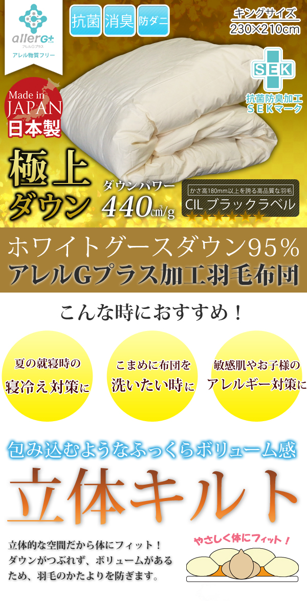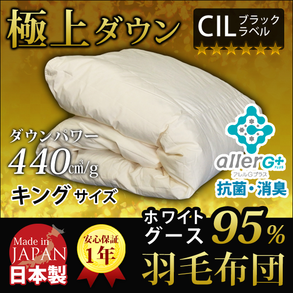 【安心の日本製羽毛布団】 お手軽 羽毛掛ふとん ホワイトグースダウンがたっぷり入った羽毛布団です。 国内工場で羽毛の充填、縫製を行っているので、品質が高く、安心してお使いいただけます。 CILブラックラベル アレルG加工 アレル物質低減とデオドラント効果、抗菌・消臭加工された羽毛を使用。 ダックより保温性が高いホワイトグース 「グース」は、日本語でガチョウのことです。 「ダック(アヒル)」に比べ、体が大きいため、羽も大きくダウンボール (胸のあたりにあるタンポポのような白い綿毛)に、より多くの空気を含み ますので、保温性が高いです。 また、羽枝が細くてやわらかくコシがあるため、丈夫な上に、布団に使用 したときに肌触りが良くて体にフィットします。 クリーンオゾン加工 この羽毛ふとんに使用されている羽毛にはオゾン(O3)加工を施しています。 薬品を一切使用しない人や環境にも優しい最新の加工です。 ファインアップ加工 羽毛に活力を与えるとともに不純物を取り除く、ファインアップ加工を施しています。 本来の性能を最大に発揮できるように充分にリフレッシュした羽毛を使用しています。 日本製 国内工場で生産を行っております CILギャランティーラベル ブラックラベル 厳格で適正な全ロットの事前検査を通し、CILが定めた品質・性能基準をクリアできた場合にのみ合格認定証を発行します。組成混合率、ダウンパワー、臭い、清浄度など様々な指標を適切な方法で検査することで、充填羽毛がその性能を発揮する最適な状態を保持し、安心してご使用いただけることを保証します。