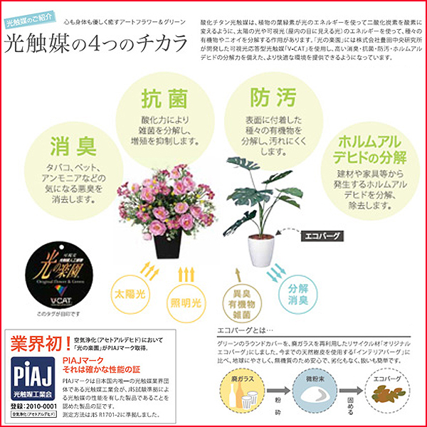 しかも、飾るだけでお部屋の空気を浄化してくれる「光触媒機能付き」だから、目で楽しめ、機能でもうれしい。
