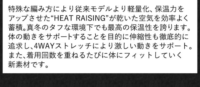 特殊な編み方により従来モデルより軽量化、保温力をアップさせたHEAT RAISINGが乾いた空気を効率よく蓄積。