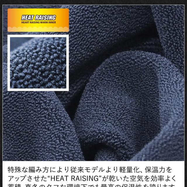 特殊な編み方により従来モデルより軽量化、保温力をアップさせたHEAT RAISINGが乾いた空気を効率よく蓄積。
