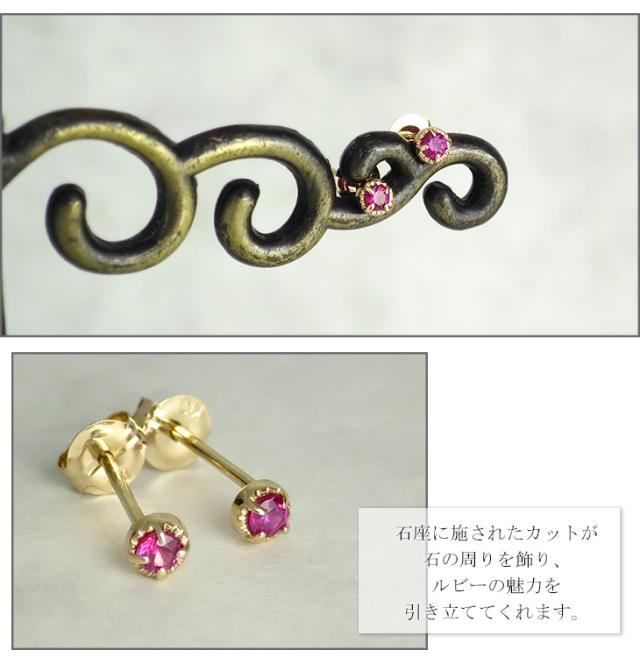 華やかで情熱的な赤色がキラキラと輝き、可愛くも色気漂うルビーのゴールドピアスです。