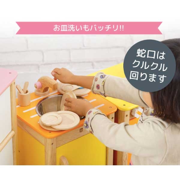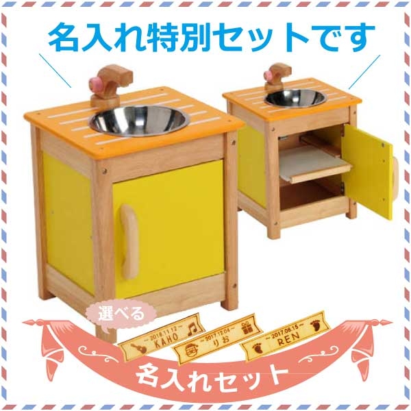 [出産祝いやお誕生日のギフトにぴったりな、人気の木のおもちゃ、名入れセット] 本格的なおままごと木製キッチン、マイプレイキッチンシリーズです。かわいいオレンジの洗面台には、ピンクと水色のネジ付き蛇口やボウルなどリアルでキュート♪洗面台の下には収納スペースも◎引き出せるトレイ付きでおかたづけトレーニングにもおすすめ!アイムトイの木製玩具は、"にぎる"、"つなげる"、"通す"、"むすぶ"といった、指先の動きを追求して作られた木のおもちゃです。ヨーロッパの厳しい安全基準に基づき、おもちゃの安全はもちろん、万が一お子様がなめても安全な塗料を使用しています。また、アイムトイのおもちゃは、環境に配慮しゴムの木をリサイクルして生まれます。〜 ご注文時方法 〜1.商品をカートに入れる。2.備考欄へ絵柄の番号と