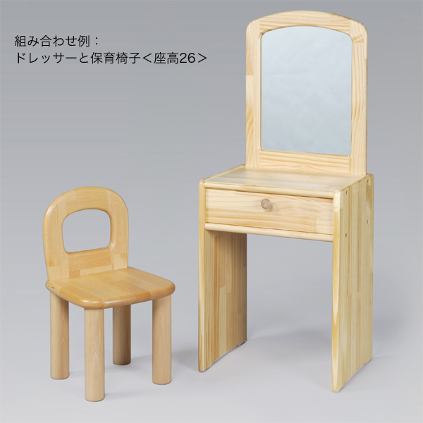 | 幼稚園・保育園にオススメなブロック社の木製ごっこ遊び用鏡台。おままごと、ごっこ遊びのコーナー作りにピッタリです。 ドレッサーの鏡には衝撃に強い 熱処理仕様のガラス(厚さ3.3mm)を使用しています。 安全の為に引き出しにはストッパーが付いています。 保育椅子<26>と組み合わせて使用できます。 白木棚や椅子、テーブルと同じ素材なので一緒に並べても違和感なく使用できます。 子どもの想像力を引き出しやすいシンプルなデザインです。 ※ドレッサーの高さを調整したい場合は、お問い合わせ下さい。 |