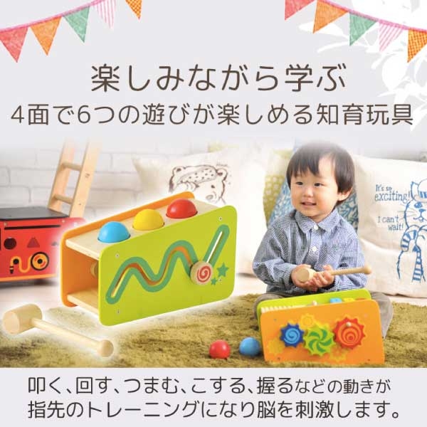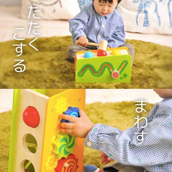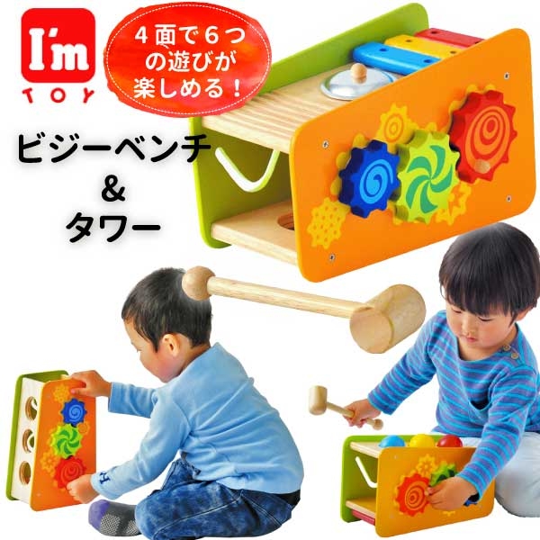 1歳半頃の男の子、女の子、1歳の誕生日プレゼントにおすすめ。知育玩具、多機能の指先遊びがひとつになったビジーベンチ。4つの全ての面に遊びがつまったアクティブに遊べるおもちゃ。ハンマー遊びのハンマーを 逆に握れば楽器遊びの撥に早変わり。たくさんの指先遊びでお子様の知的好奇心やファインモータースキルの発達をサポートします。■I’m TOYアイムトイシリーズは「握る」「つなげる」「通す」「結ぶ」といった指先の動きを追求して作られた木のおもちゃです。