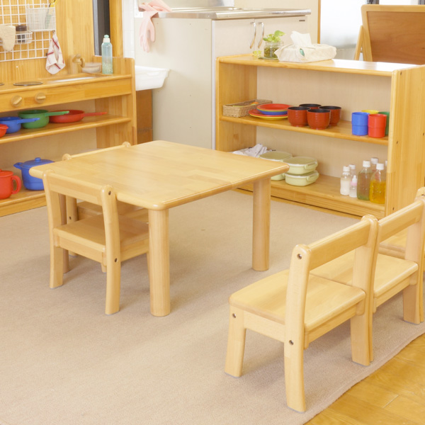 ○子どもの身体のサイズにあうように作られた椅子や机は、いずれもパインやブナの集成材を使い、耐久性にも優れています。