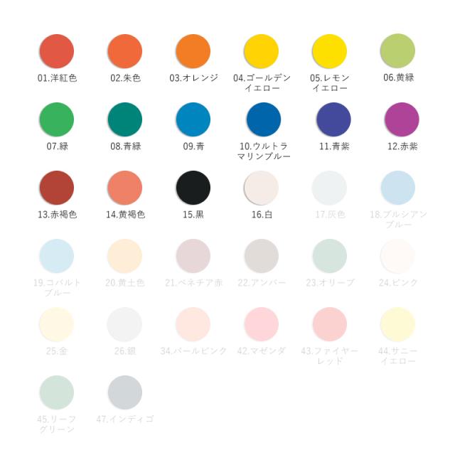 01.洋紅色 02.朱色 03.オレンジ 04.ゴールデンイエロー 05.レモンイエロー 06.黄緑 07.緑 08.青緑 09.青 10.ウルトラマリンブルー 11.青紫 12.赤紫 13.赤褐色 14.黄褐色 15.黒 16.白