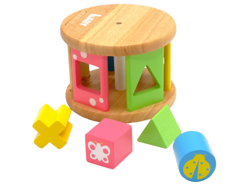 KOROKOROパズルの中に、パズルパーツを入れて、横にして転がすと、パーツ同士がぶつかって天然木ならではの優しい音を奏でます。チョウチョとてんとう虫のイラストのついたパーツには、大きさの異なる木製ビーズが入っています。ガラガラの様に振って音を楽しんで下さい。KOROKOROパズル本体には、4種類の形がくりぬかれています。難しいようなら、ママがヒントをあげて下さいね。