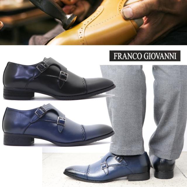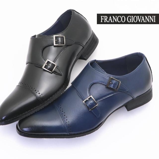 本革 (希少ネイビー色) ダブルモンクストラップ メダリオン ビジネスシューズ FRANCO GIOVANNI(フランコジョバンニ)No2303