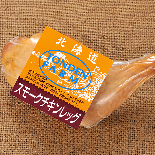 鶏の骨付きモモ肉をトンデンファームこだわりの直下式炭火製法で燻煙・乾燥させた、ほんのり塩味のスモークのきいたスモークチキンレッグです。