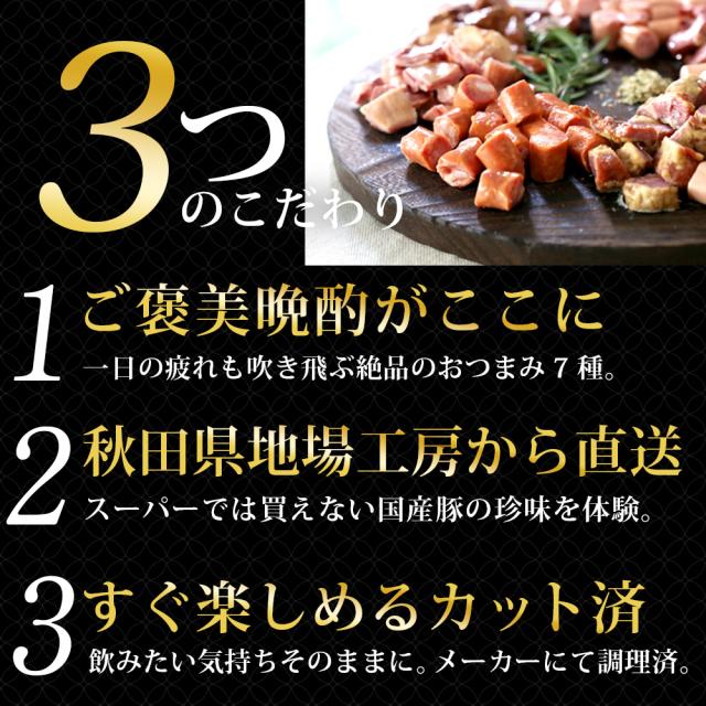 | 内 容 量 | ・ウィンナー 50g×1P ・粗挽きウィンナー 50g×1P ・チョリソー 50g×1P ・豚はらみくんせい 50g×1P ・スモークレバー 50g×1P ・ガツ 50g×1P ・ハツ 50g×1P |