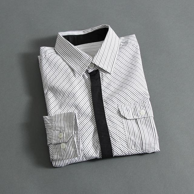 シンプルなデザインの長袖シャツです。フェイクタイになったフロントがシンプルなデザインに