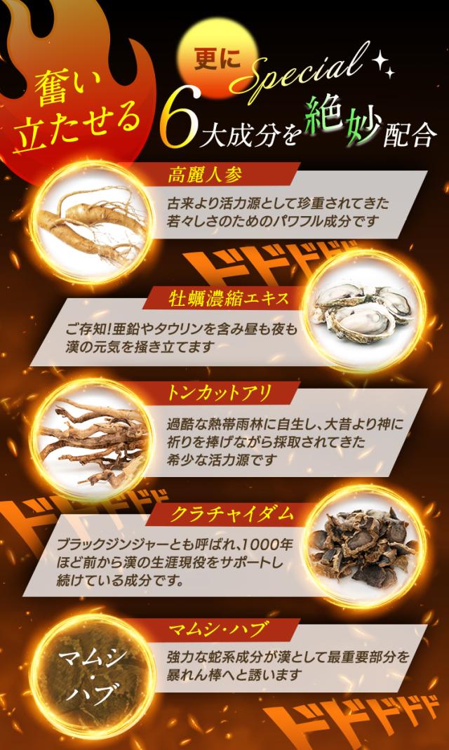 ・原材料:マカ末(ペルー産)、高麗人参末、牡蠣エキス末、トンカットアリ末、クラチャイダム、ガラナ末、マムシ末、ハブ末、唐辛子末/セルロース、ステアリン酸Ca、微粒二酸化ケイ素