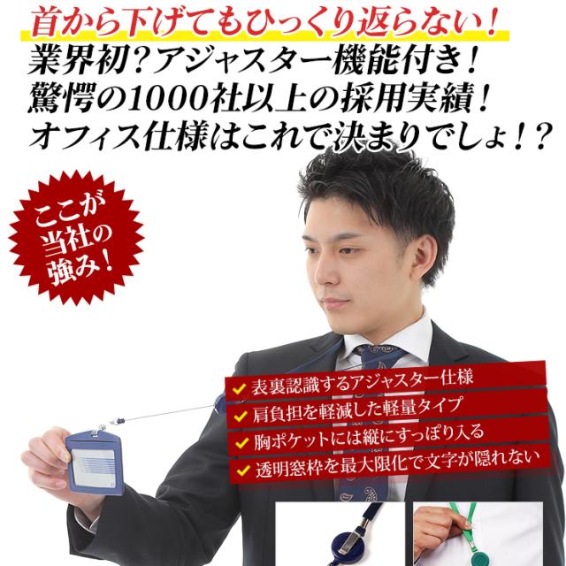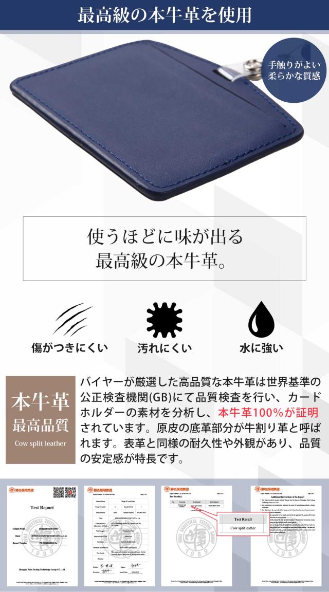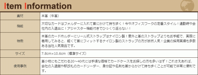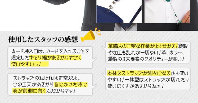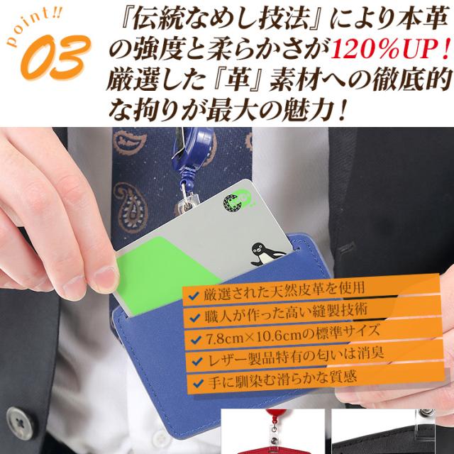 本革仕様&パステルカラーのお洒落な社会人用に制作された「革職人シリーズ」の商品です。 IDカード導入企業も増え続ける昨今の日本社会!会社の入退出用、オフィス毎や部署単位でのセキュリティ管理としてカードフォルダーは必須アイテムです!大切なカードはフォルダーに入れて首にかけて持ち歩く!今やオフィスワークの定番スタイル!通勤時や会社内の入退出で今や必須のカードホルダー!スーツや仕事着だけじゃなく、革鞄や革小物にもこだわる20〜40代には手頃な価格なカードケースをお探しの方も多いはず。これさえあれば、朝夕の自動改札での通過がスムーズ、毎日の通勤を快適にサポートいたします。本革のカードホルダーにリール式ストラップはナイロン製!意外と革のストラップよりもお手軽で実際に着用してみると軽くて首にフィットするナイロン製のストラップが使い勝手が良いものです。牛革は、長く愛用すれば、その時間に比例して本革の風合いが熟成し、愛着が滲み出てきます。毎日の必需品だからこそ、手に持って革の変化を確かめるのが愉しく素敵なアイテムです!