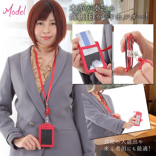 ID カードホルダー 本革 革職人が作った 本物の質感 牛革 縫製 色合い ビジネス 会社 学校 リール式ネックストラップ付き 縦型