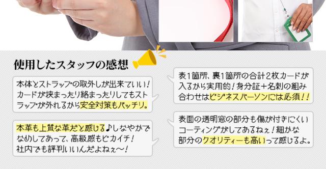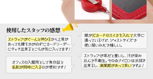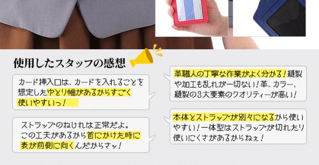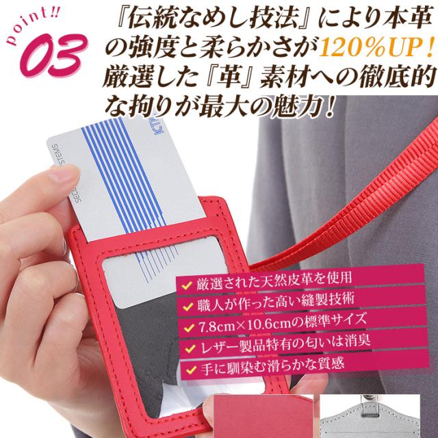 本革仕様&パステルカラーのお洒落な社会人用に制作された「革職人シリーズ」の商品です。 IDカード導入企業も増え続ける昨今の日本社会!会社の入退出用、オフィス毎や部署単位でのセキュリティ管理としてカードフォルダーは必須アイテムです!大切なカードはフォルダーに入れて首にかけて持ち歩く!今やオフィスワークの定番スタイル!通勤時や会社内の入退出で今や必須のカードホルダー!スーツや仕事着だけじゃなく、革鞄や革小物にもこだわる20〜40代には手頃な価格なカードケースをお探しの方も多いはず。これさえあれば、朝夕の自動改札での通過がスムーズ、毎日の通勤を快適にサポートいたします。本革のカードホルダーにリール式ストラップはナイロン製!意外と革のストラップよりもお手軽で実際に着用してみると軽くて首にフィットするナイロン製のストラップが使い勝手が良いものです。牛革は、長く愛用すれば、その時間に比例して本革の風合いが熟成し、愛着が滲み出てきます。毎日の必需品だからこそ、手に持って革の変化を確かめるのが愉しく素敵なアイテムです!