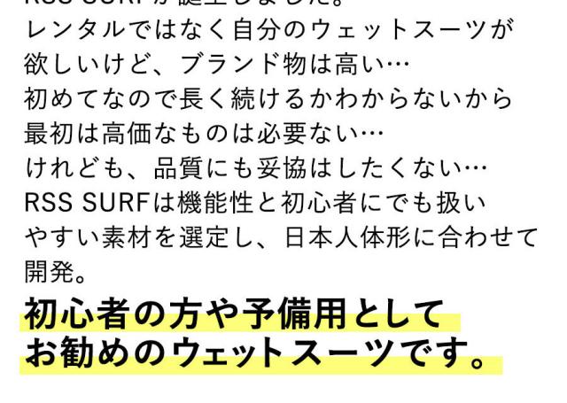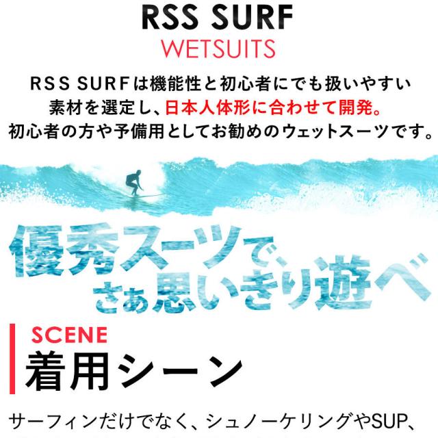 RSS SURFは機能性と初心者にでも扱いやすい素材を選定し、日本人体形に合わせて開発。初心者の方や予備用としてお勧めのウェットスーツです。