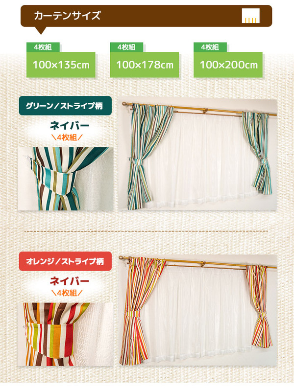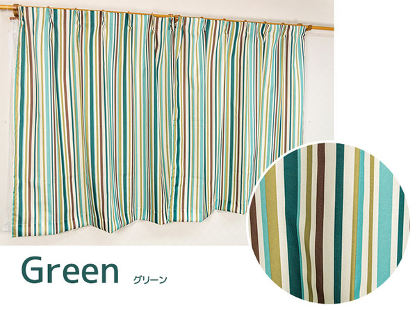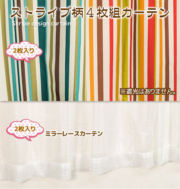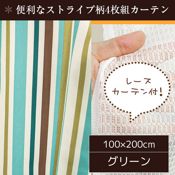 ストライプ柄4枚組カーテン 100×200 グリーン ミラーレース付き 洗える アジャスターフック タッセル付き ネイバー 【北海道・沖縄・離島配送不可】