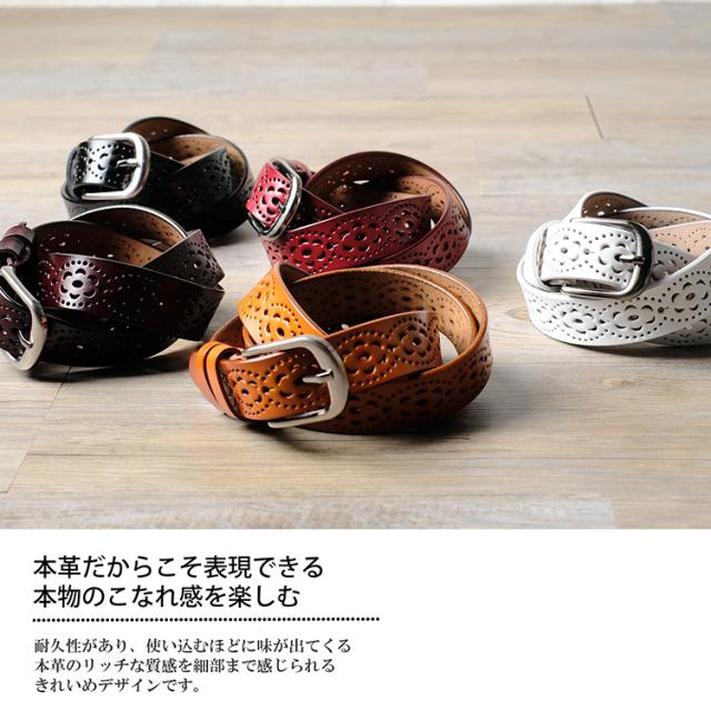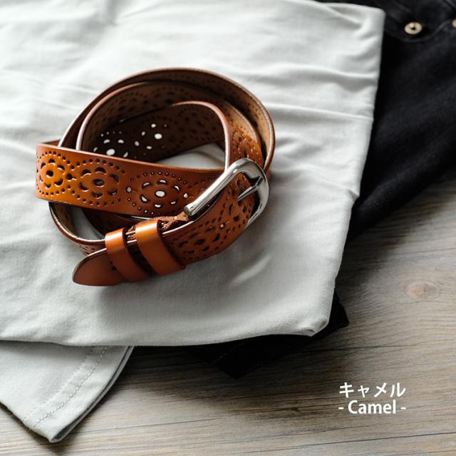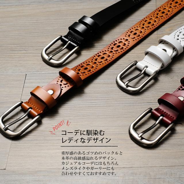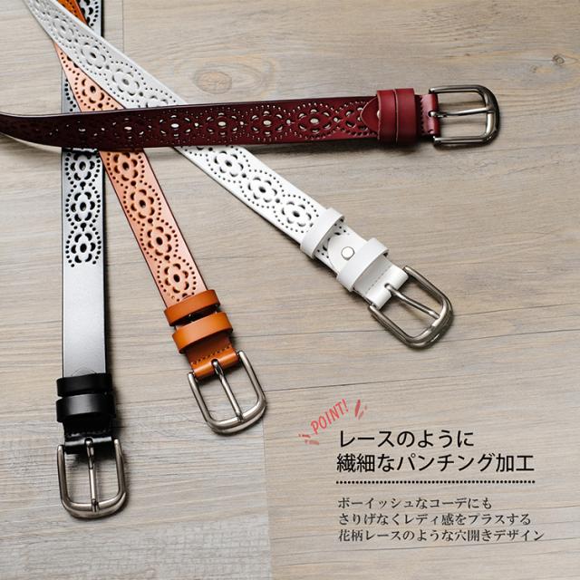 コーデの仕上げにプラスワン♪ レースのような繊細なパンチング加工で カジュアルなコーデにも レディ感をさり気なくプラス。 本革にナチュラルに馴染むコーデに プラスしやすいデザインベルトです。 |