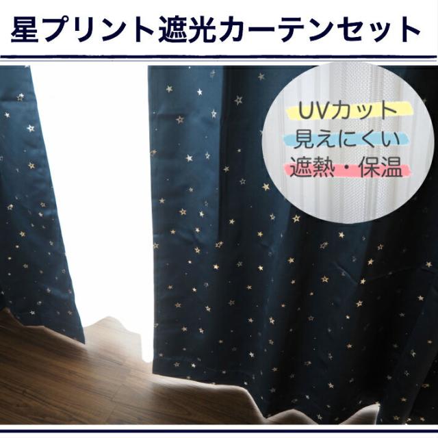 星柄箔プリント1級遮光カーテン&多機能レースカーテン4枚組 幅100×丈110,135,150,178,185,200,230cm