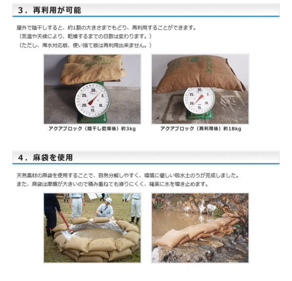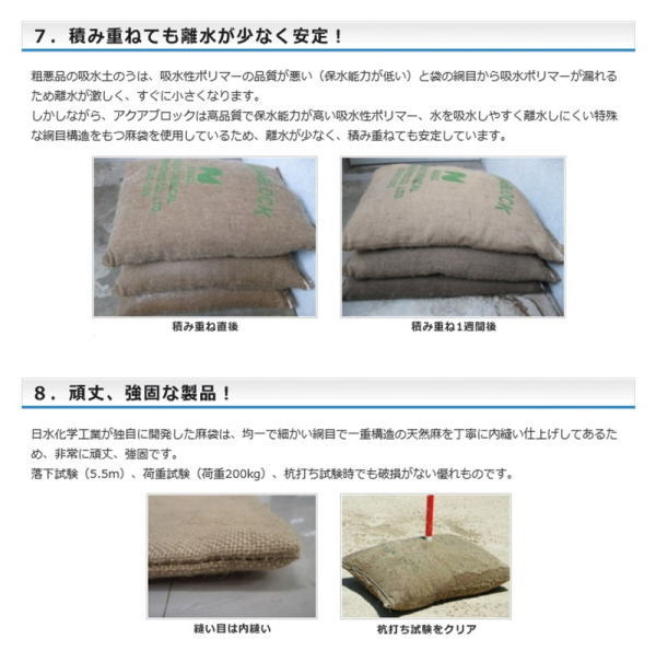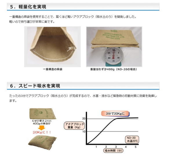 たった3分!水だけでふくらむ土を使わない吸水性土のう!水害・浸水など緊急時の初動対策に!「すばやく・簡単に・確実に」お役に立ちます。【品名】ND-20【製品サイズ(mm)】600x420【吸水前重量】400g【吸水後重量】20Kg【入数(1箱あたり)】20枚【荷姿重量】9.5Kg【荷姿サイズ(mm)】 640×460×140【商品仕様】●吸水剤:高吸水性ポリマー ●外袋:天然麻繊維 ●外箱サイズ(mm): 640×460×140【備考】再利用可能版、使い捨て版は、海水や海水を含む水ではご使用できません。(海水に使用する場合は、海水対応版をご利用ください。) 酸性の水(pHが4以下)、アルカリ性の水(pHが10以上)にはご使用できません。直射日光の当る場所や高温多湿の場所での保管は避けてください。ポリマーが流出した場合は、水で洗い流してください。用途以外には、ご使用にならないでください。