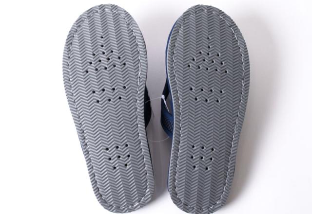 徹底した通気ぶり底面には硬めのクッション材を使用しているが、こらにも通気孔を設けた仕様。足裏・サイド・底面の徹底した通気性へのこだわりに驚いて欲しい。すべり止め仕様ではないので、滑りやすいフローリングには要注意。