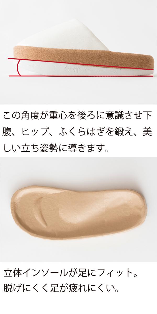 ●足底部分に角度がついている為、重心を後ろに意識させ下腹、ヒップ、ふくらはぎを鍛え、美しい立ち姿勢に導きます。
