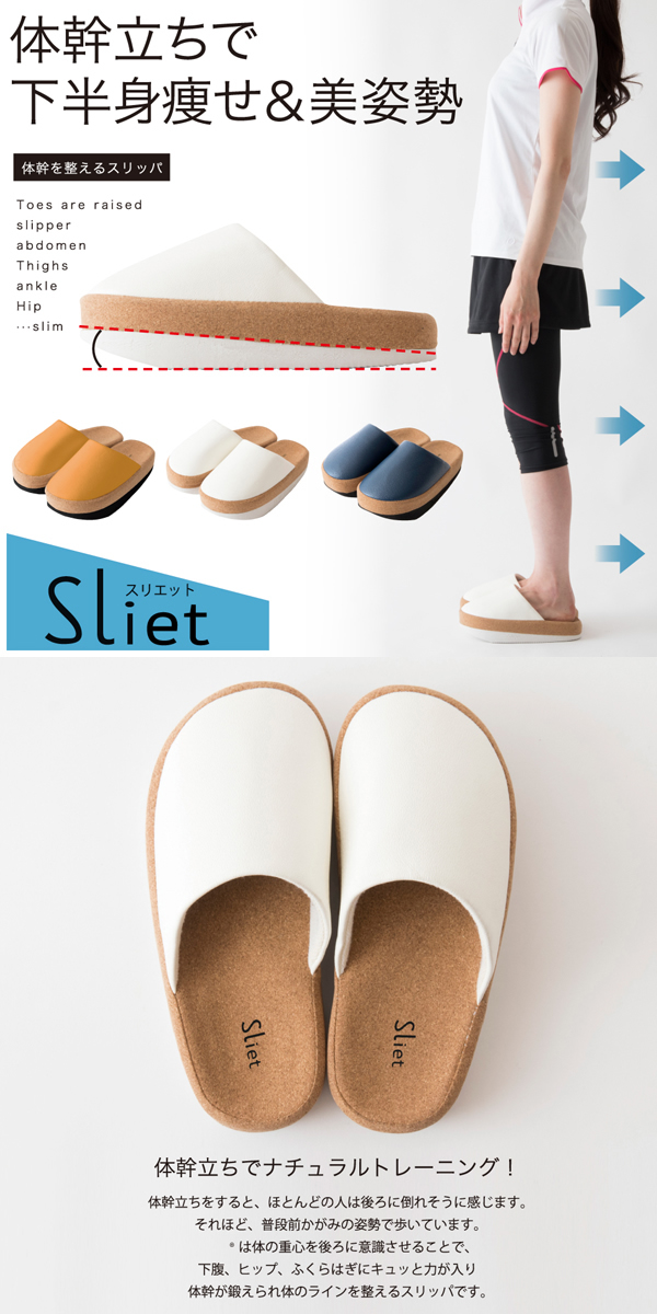 ●Slietは体の重心を後ろに意識させることで、下腹、ヒップ、ふくらはぎにキュッと力が入り体幹が鍛えられ体のラインを整えるスリッパです。