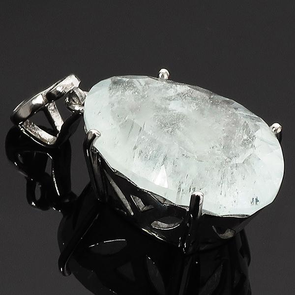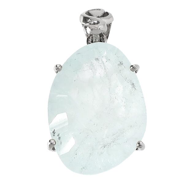 白色がかった淡い水色のアクアマリンで、中央は平らにカットされており、光の反射による輝きが印象的。