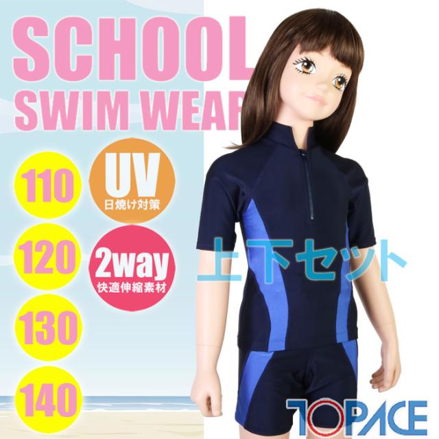 スクール対応メーカー、TOPACE (トップエース)の安心スクール水着☆学校やスイミングスクール、海での着用に最適です♪スクール水着の主流となりつつある半袖セパレート型水着(上下セット)☆《おすすめポイント》・日焼けしやすい首筋や肩をやさしくガード!!・脱ぎ着ラクラクのフロントファスナー!!・タテ・ヨコに伸びて動きやすい2wayストレッチ素材。■カラー⇒ネイビー(ライン入)■素材⇒ナイロン80%、ポリウレタン20%■サイズ:バスト/ヒップ(cm)⇒100:49-55/55-61、110:53-59/58-66、120:57-63/62-70、130:61-67/66-74、140:64-72/70-78