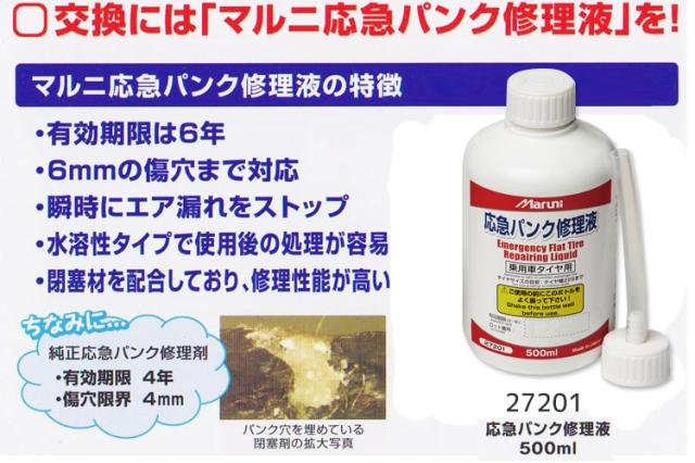 パンク修理剤 応急パンク修理液 500ml 車用 マルニ 27201 有効期限6年 スペアタイヤレス車に